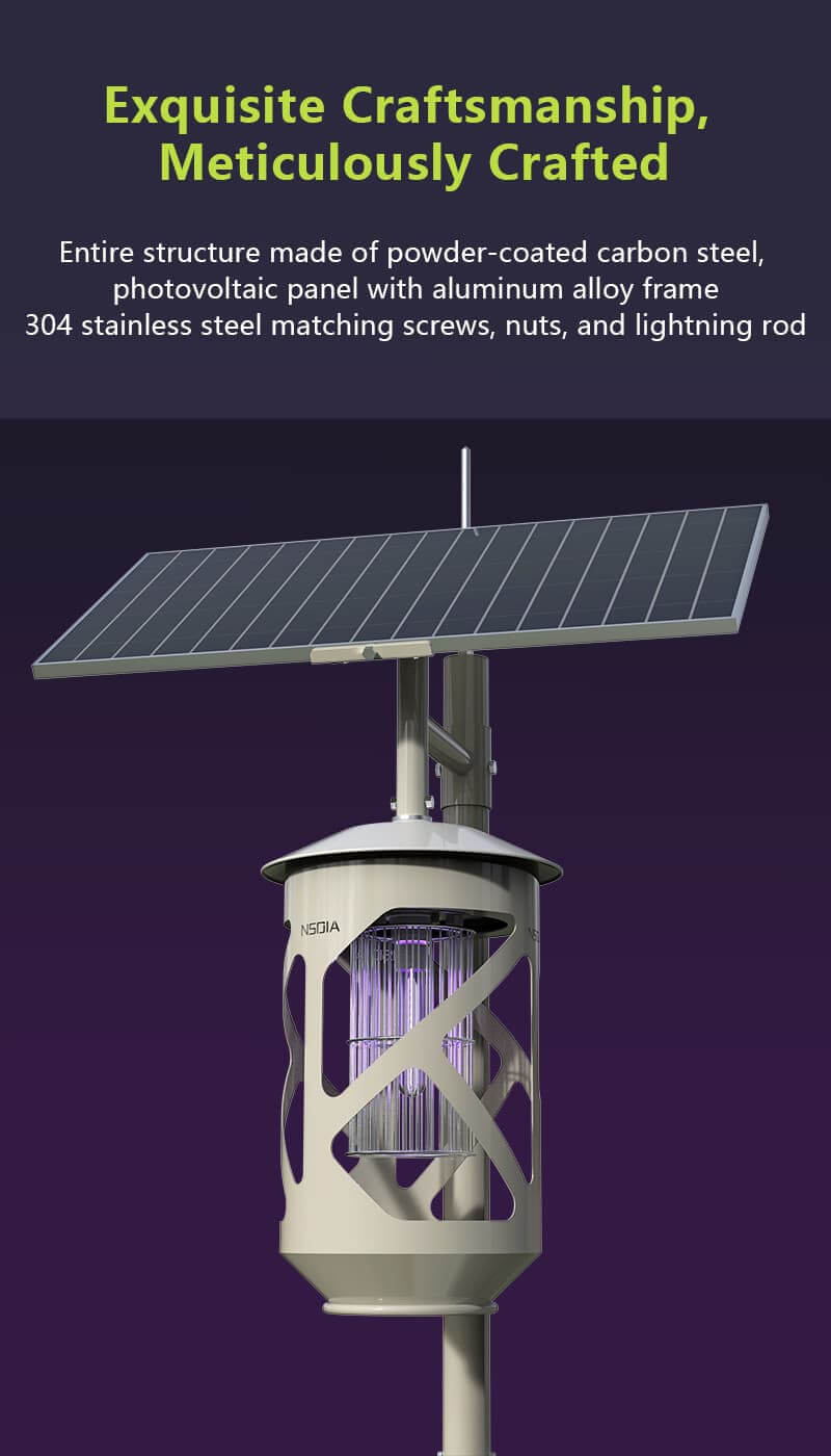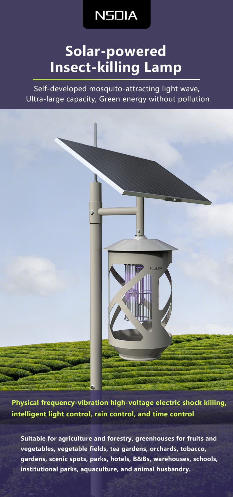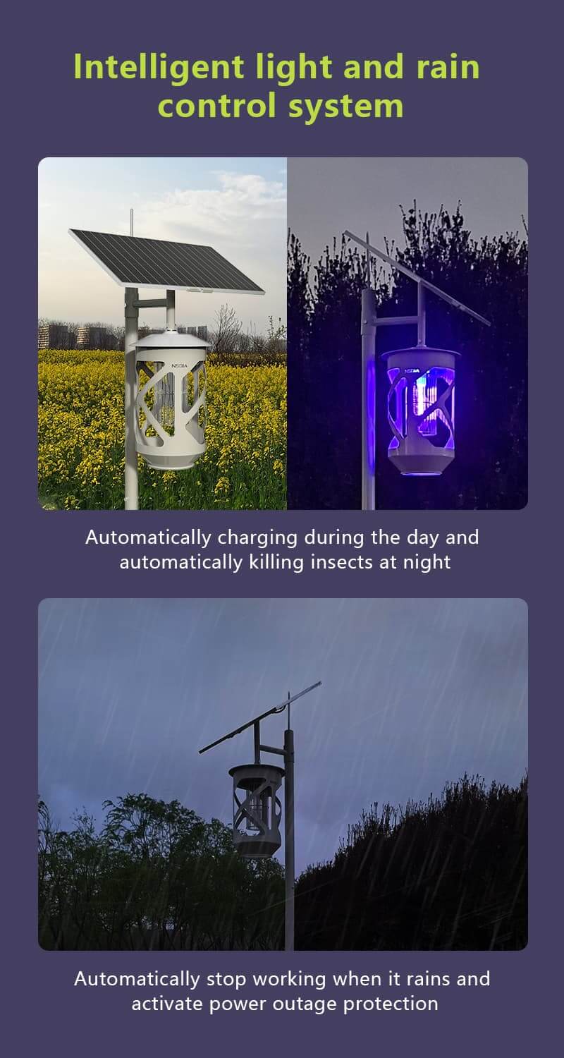 6. Intelligent light and rain control system, no manual control required, automatically charges during the day, automatically kills insects at night, and automatically cuts off power for protection in rainy weather.