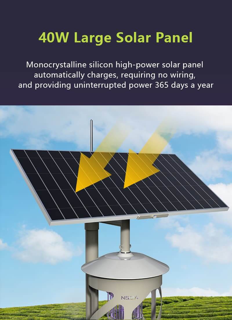 2. 40W monocrystalline silicon high-power solar panel, automatically charging, requiring no wiring, and providing uninterrupted power 365 days a year.