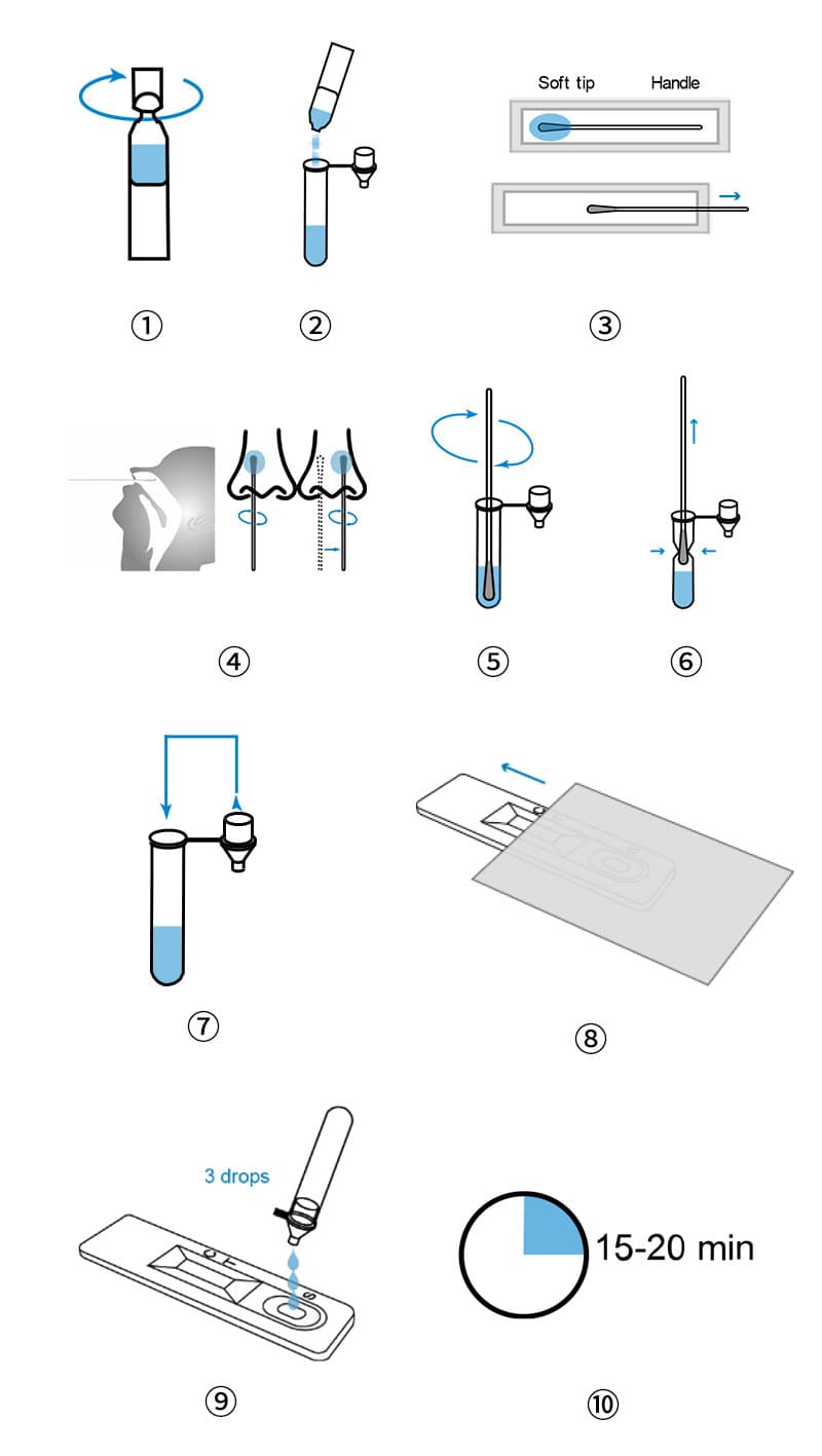 Carefully insert swab into one nostril. The swab tip should be inserted no less than 2.5 cm (1 inch) from the edge of the nostril. Roll swab 3-4 times along the mucosa inside the nostril. Leave swab in the nostril for several seconds. Using the same swab, repeat this process for the other nostril. Withdraw swab from the nasal cavity. Caution: This may feel uncomfortable. Do not insert the swab any deeper if you feel strong resistance or pain.