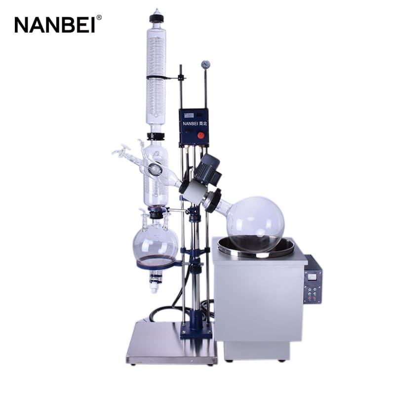 NANBEI Rotary Evaporator widely used in laboratories. Suitable for reflux operation, rapid evaporation of a large number of solvents, concentration of trace components, and reaction processes that require stirring. The rotary evaporator system can be sealed and decompressed to 400 to 600 mm Hg; the solvent in the distillation flask is heated by a heating bath, and the heating temperature can be close to the boiling point of the solvent; at the same time, it can be rotated at a speed of 50 to 160 rpm The solvent is formed into a thin film, and the evaporation area is increased. In addition, under the action of a high-efficiency cooler, the hot vapor can be quickly liquefied, which accelerates the evaporation rate.