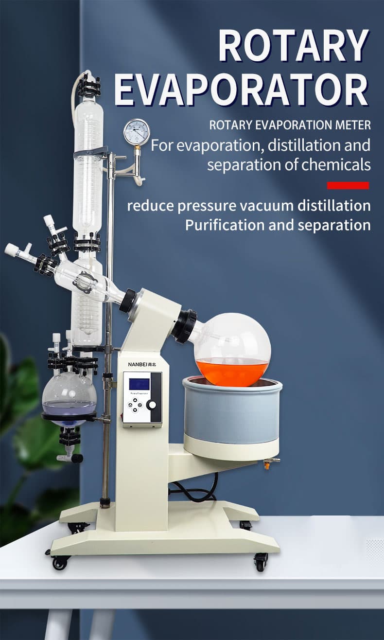The main capacity of the rotary evaporator (device) produced by NANBEI Company is 1-2L, 3L, 5L, 10L, 20L, 30L, 50L, 100L. Each capacity has different grade models for customers to choose. This product can be used with a vacuum pump to improve the evaporation efficiency (required); it can be used with a low-temperature coolant circulation pump to improve the recovery efficiency. Customers should purchase matching equipment as appropriate.