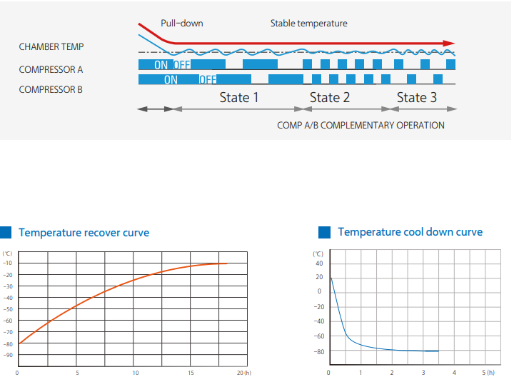 ◆Two independent systems, in thecase of an unexpected failure of one cooling circuit, the other can maintainthe freezer’ s temperature uniformlyin the -80℃ range.