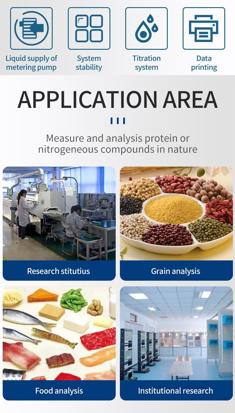 Protein Tester is used to universally determine crude protein content with wide spectrum of application form food supplies, beverage, cotton and other agricultural products by Kjeldahl method.