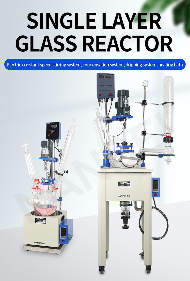 Single glass reactor inner placed reaction solvent which can be stirred, interlayer can be filled with cold or hot liquid(frozen liquid, water, gas or hot oil) to do the thermostatic heating/cooling reaction, single layer glass reaction kettle is heated by computer control oil bath or electric heating. At the same time, it can be worked at atmospheric pressure or vacuum state, to control the reaction solution reflux and distillation, it is the ideal equipment for modern synthesis chemical, biological pharmaceuticals and making new materials, used for preparation experiment and production equipment.