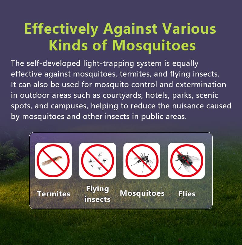 1. Self-developed mosquito-attracting light system significantly improves insect control efficiency, effective against over 1000 pests.