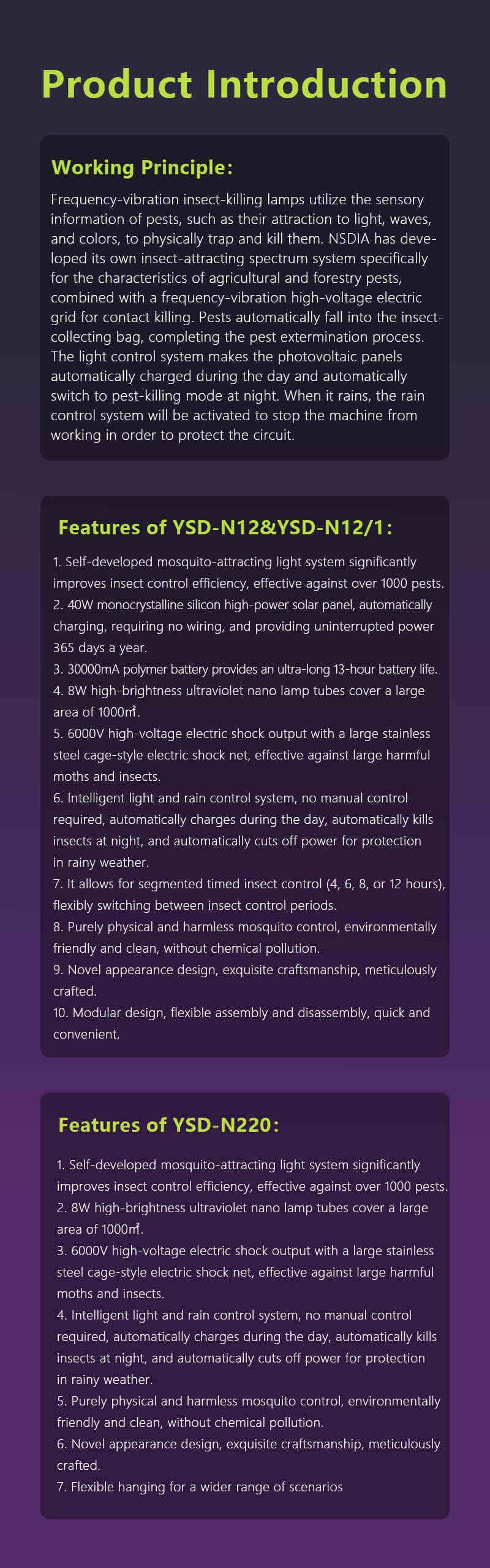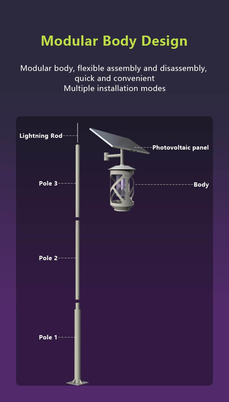 6. Intelligent light and rain control system, no manual control required, automatically charges during the day, automatically kills insects at night, and automatically cuts off power for protection in rainy weather.