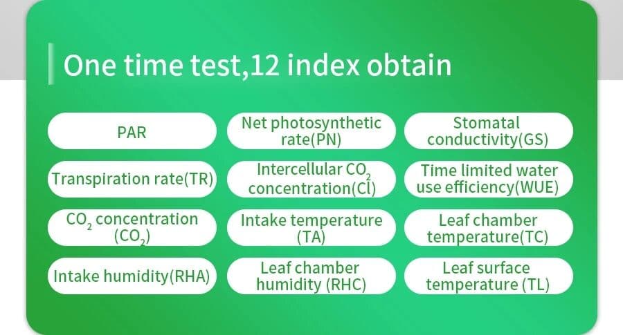 2.Can test photosynthetic rate, steaming rate, stomatal conductance,and CO2 density of plants.