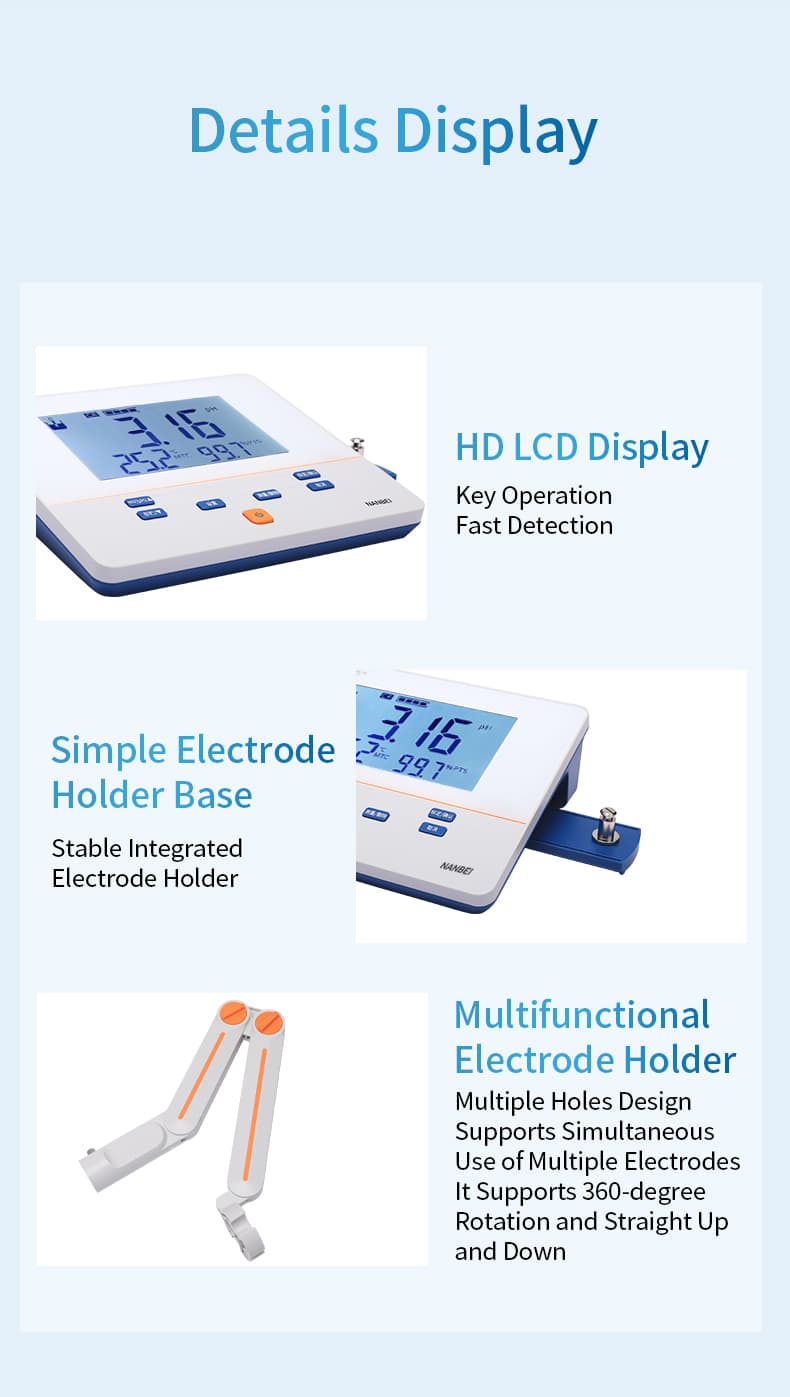 The instrument is widely used to measure acidity (pH) of various solutions.By using an ion electrode properly it is applicable for measuring the electrode potenial(mv) in relative ionic concentration.