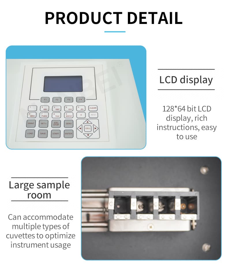 ●Intelligent degree is high: Dual CPU embedded system hardware design of super reliable,128*64 LCD display, rich instruction, without reading the manual, is simple and convenient to use; custom wavelength correction and automatic wavelength calibration function, replacing the artificial adjustment link; light source using time automatic accumulation, convenient view to understand, light source switch menu can be in the instrument does not use circumstances to choose to close, prolong the equipment service life.