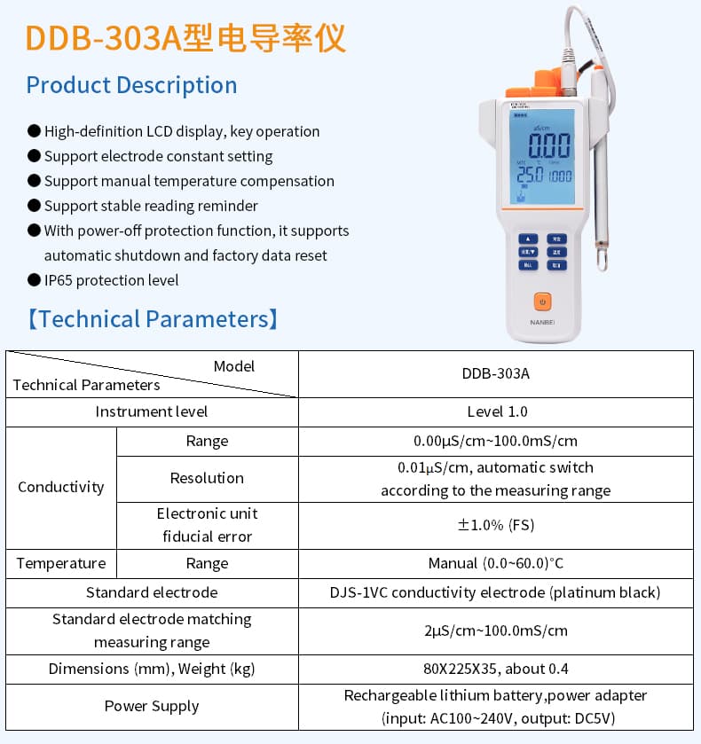 Conductivity: 0.00μS/cm~100 mS/cm, four kinds of measuring range can be switched