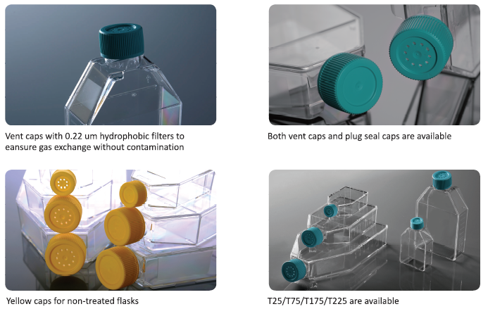 | Cat.No. | Cell Growth Area (cm²) | Cap Style | Volume (mL) | Rcommended Medium Volume(mL) | TC | /Pack | /Case |