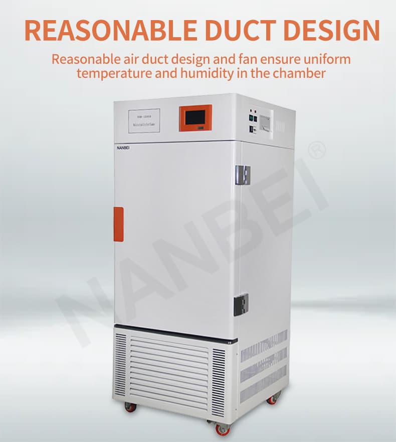 3. unique air duct circulating design, air ducts ensures wind distribute evenly in chamber, a test hole(diameter-25mm) is placed in left side of chamber