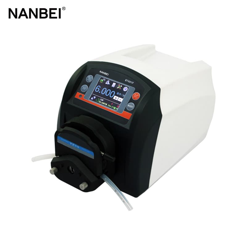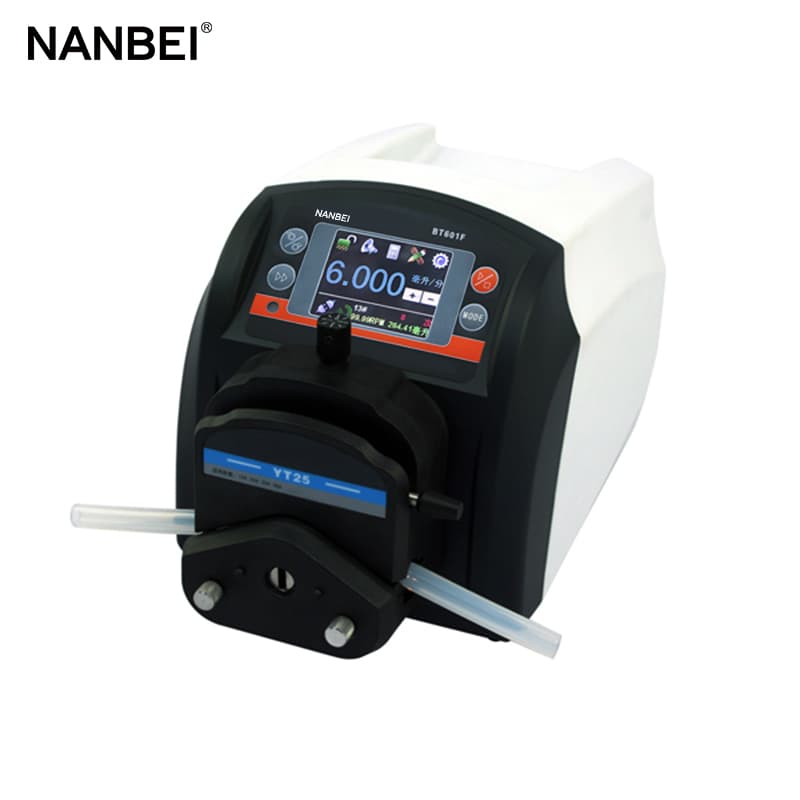 BT601F Intelligent dispensing peristaltic pump flow range is 0.06-2300ml/min. It adopts color LCD touch screen with intuitive and clear displaying interface, easy to operate. Mainly used for accurate measurement and distribution of fluid. If need high accuracy when dispensing, volume dispensing mode is available; if need high producing efficiency, time dispensing mode is more convenient; if want to separate fluid to number of equal parts, copy dispensing mode would be best. When working on flow mode, it is as same as intelligent flow peristaltic pump. The pump adopts intelligent temperature-control technology to reduce working noise. RS485 interface, as adopting the MODBUS communication protocol, the pump is easier to be connected with other equipments, such as computer, human machine interface and PLC.